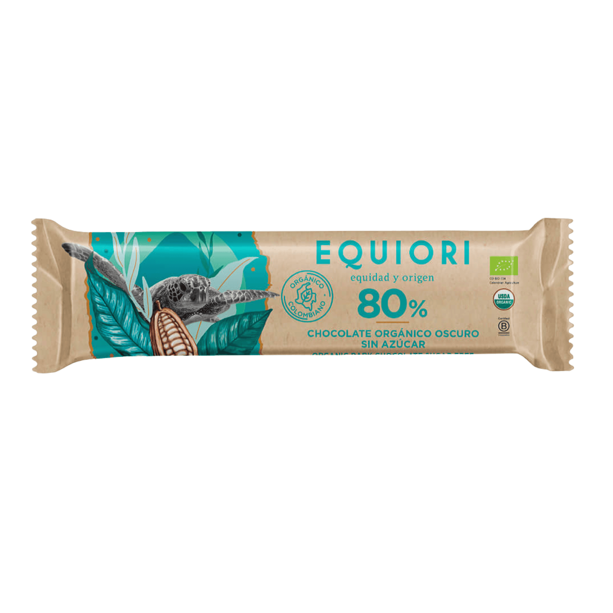 Chocolate orgánico Equiori 80% cacao colombiano, muy bajo en azúcar. Máximos beneficios antioxidantes para tu salud.